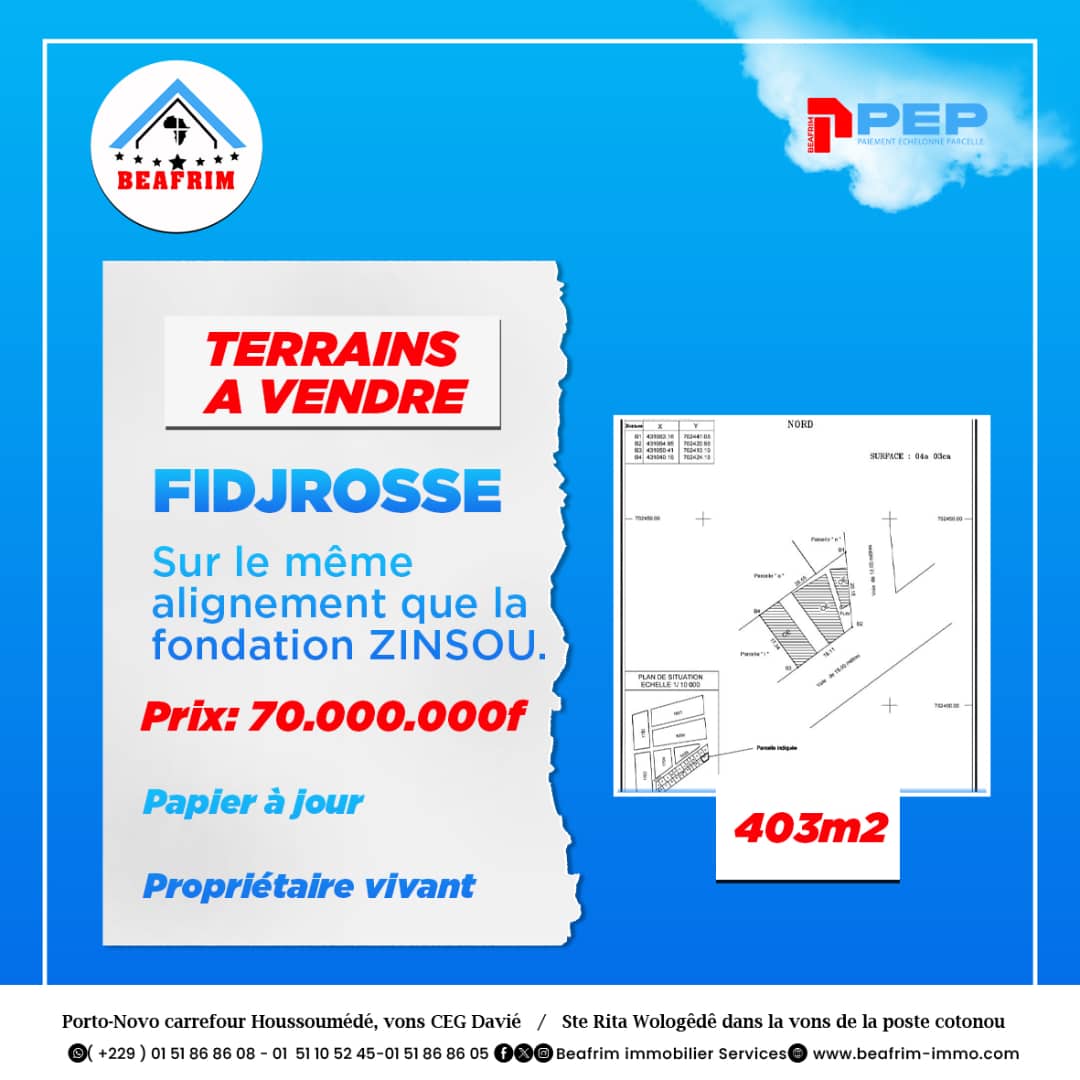 Nous proposons à la vente un terrain bien situé à Fidjrossè, sur le même alignement que la Fondation Zinsou, dans une zone recherchée et accessible. La superficie est de 403 m², idéale pour un projet résidentiel ou commercial. Prix : 70.000.000 FCFA Documents et garanties : Papier à jour Propriétaire vivant Le terrain bénéficie d’un emplacement stratégique, adapté à un investissement sécurisé et à forte valeur.